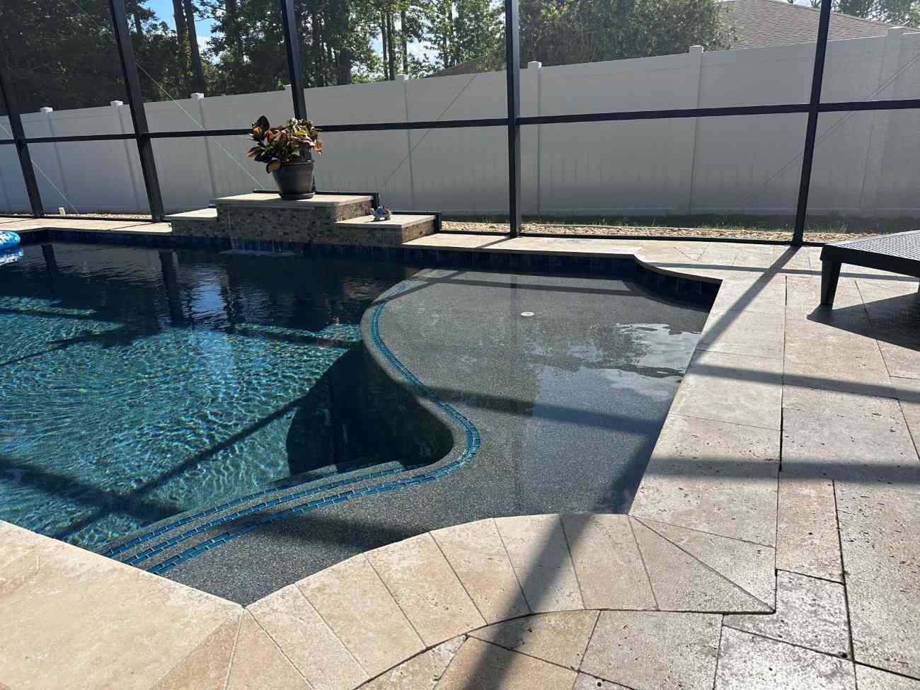 The mix of deep water color, travertine, and the raised wall gives the pool a resort vibe without being flashy.