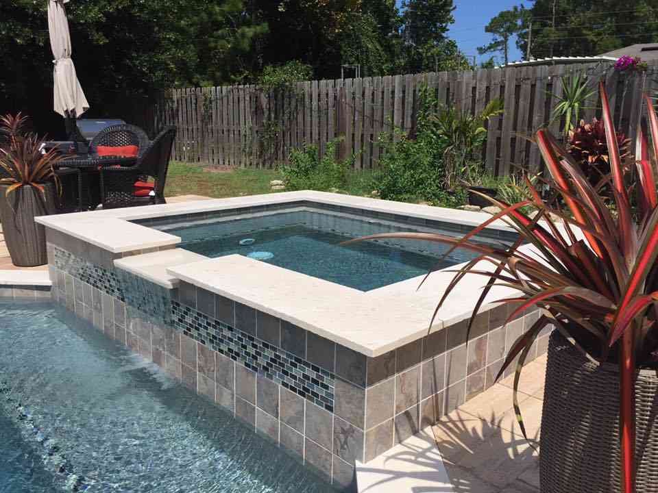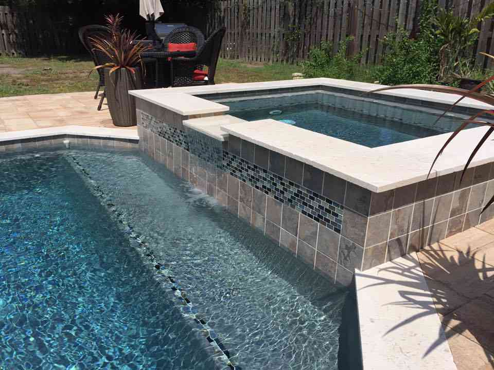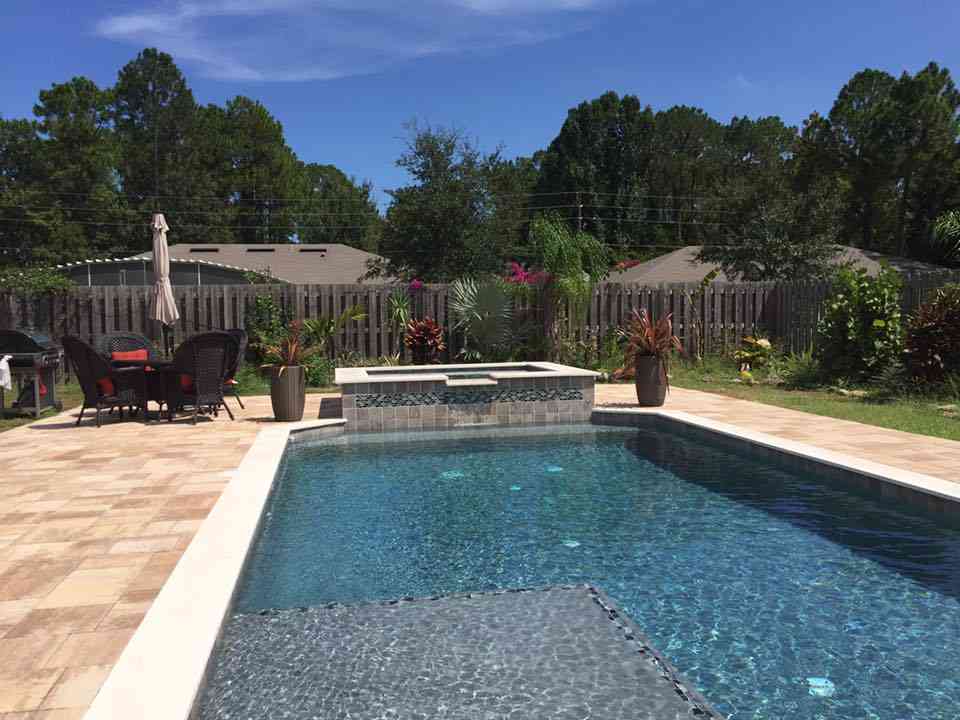 Another backyard vacation finished in the B Section of Palm Coast. This custom pool spa combo featured glass tile inserts, large paver deck, travertine coping, French silver interior finish, and sun shelf.